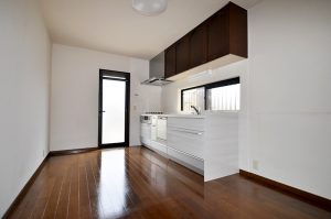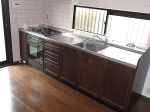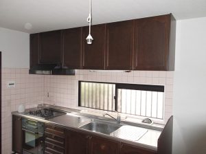 キッチン/■糟屋郡志免町 Y様邸 換気扇、キッチンを交換しました。上の棚は既存のものをそのまま利用。 タイル貼りだった前面および側面の壁は、お手入れが楽で清潔感のある素材に変更しました。 汚れたらサッとひと拭きでキレイになります。あると便利な食器洗い乾燥機も設置しました。
