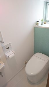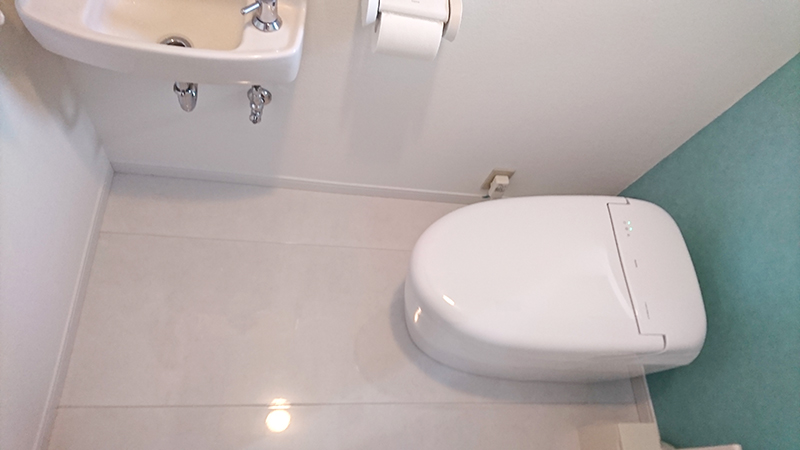 な水圧の”不足”を心配しましたが、問題なく設置することができました。床のハイドロセラはニオイの発生を抑えてくれるだけでなく汚れが染み込まないので、お手入れは水拭きだけで十分という優れもの。とことん掃除のしやすさにこだわった清潔感あふれる上質なトイレ空間となりました。