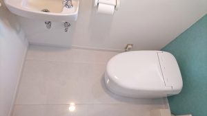 老朽化したトイレの交換リフォーム。M様は掃除が楽なTOTOのハイドロセラ(セラミックパネル)の床とタンクレストイレを希望されました。