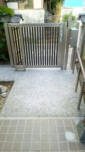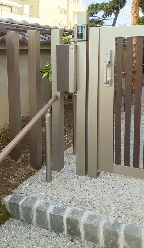 大きな石を敷いたタイプの階段の先に純和風の門があるT様邸。老朽化に伴い門の交換リフォームをお任せいただきました。石の自然な形をそのまま活かした階段は、年齢を重ねると階段の境目がわかり辛く、また凸凹があるため躓きの原因になります。そこで、ステップの一段一段の境目がひと目でわかるように変更。ステンレスタイプの手すりは門扉に合わせた色に変更し統一感を持たせました。また、同じタイプの郵便受けとドアホンも設置しました。