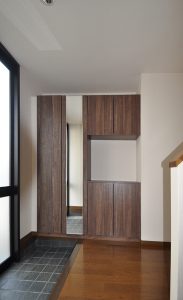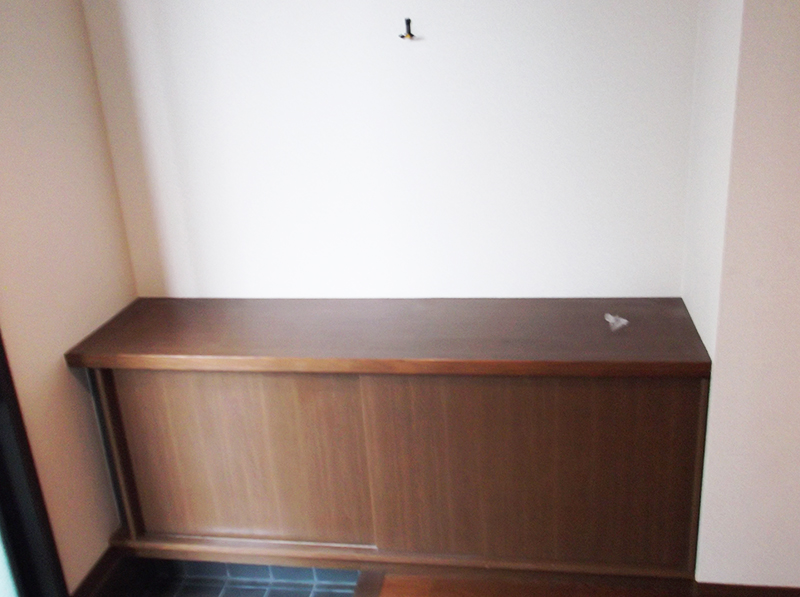 玄関/■糟屋郡志免町 Y様邸 玄関の下駄箱をコの字型のタイプに変更したことで、収納力がアップしました。 扉はおでかけ前に全身をチェックすることのできる鏡の付いたタイプのものを選択。 鏡を玄関に取り入れたことで、広がりと、鏡により光を拡散させることで明るい玄関となりました。