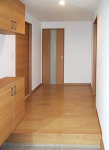 玄関/■大宰府市 N様邸 廊下の凸凹により、それぞれの部屋への動線が複雑でした。入ってすぐの隣の部屋からの でっぱりを無くすことで、スッキリしたフロアを作ることができました。 靴箱は上下に分かれた収納力のあるタイプ、床と壁紙を明るい色調に変更。 消費電力の少ないLEDのダウンライトも埋め込み、明るい玄関になりました。