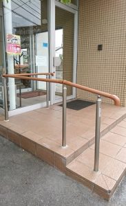 玄関/■福岡市 N医院 院長先生より、病院に来られる方の負担が少しでも軽くなるようにと依頼を受けた手すり設置工事です。高齢者は体力の低下に伴い、低い段差でも足の上げ下ろしや移動に支障をきたしますが、手すり一本でそれが大きく改善されます。ちょっとした配慮で笑顔になれる方が増える、”手すり設置”は高齢者に優しいリフォームです。