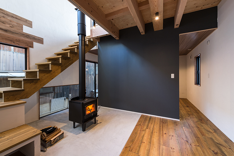 暖炉の暖かい空気が家全体に行き渡るように、空気の流れを意識したスリット階段や煙突からの放熱も有効に利用できる吹き抜け