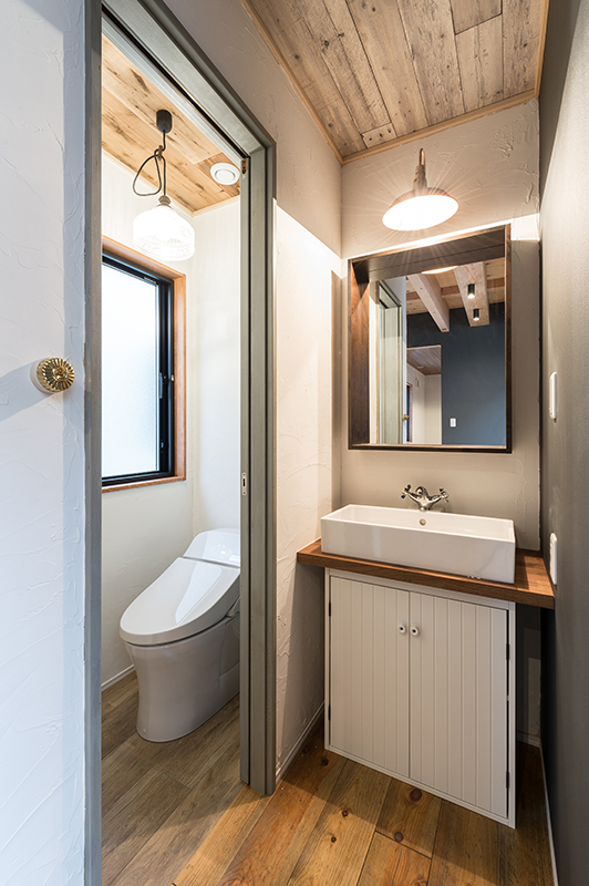 1階トイレと洗面所。ライティングによって、漆喰壁の凹凸に表情がうまれます。