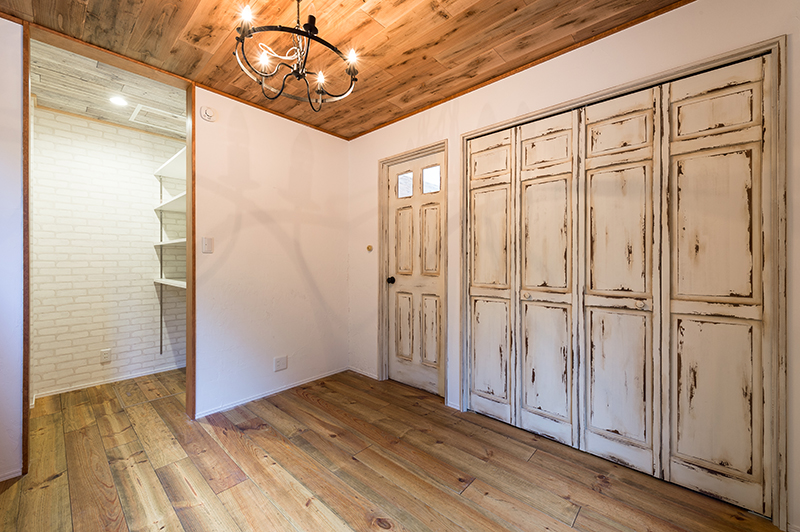 アンティーク塗装の扉と、しっくい壁、無垢材、貼り分けられた壁紙の色とで新築でも年月を経たような味わいを出すことが可能です。