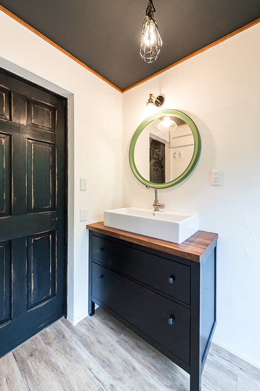 部屋の入り口の扉の色と色をそろえることで、統一感の生まれた洗面所の空間。